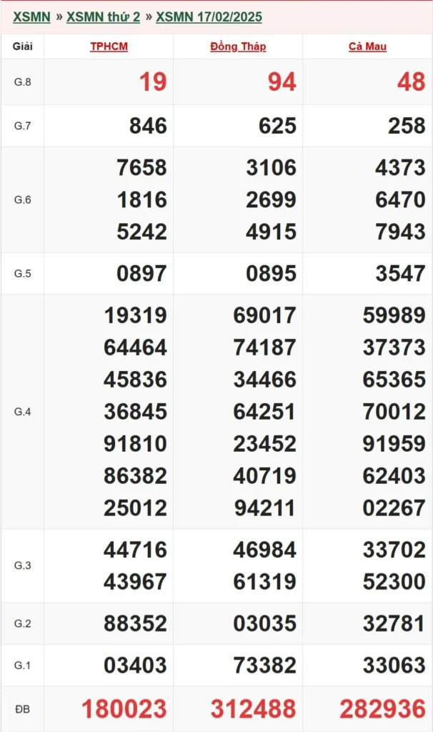Chốt lô Đồng Nai đặc biệt ngày hôm nay 17/2/2025 như sau: